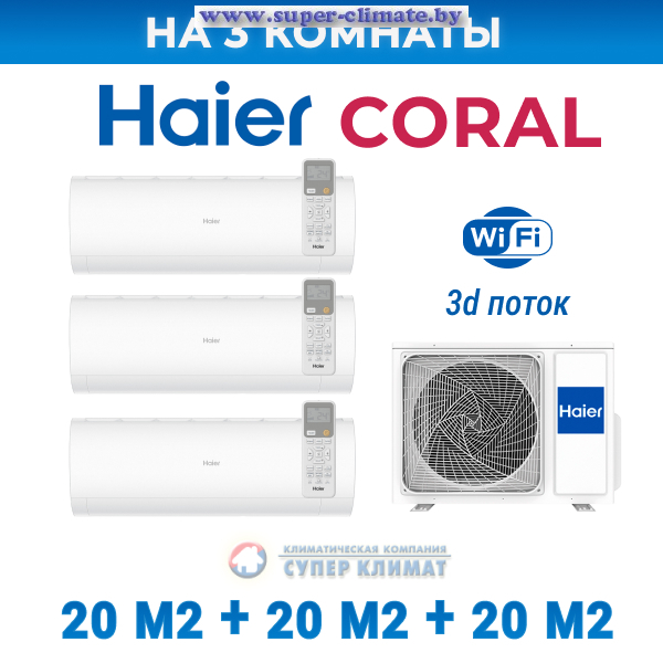 Мультисплит-система Haier Coral Super Match 3*AS20PS1HRA-M / 3U70S2SR5FA на 3 комнаты 20+20+20 м2- это современное решение для кондиционирования трёх комнат площадью до 70 м².